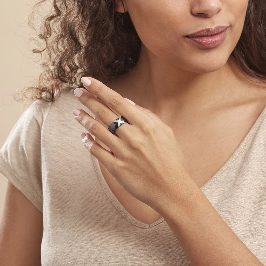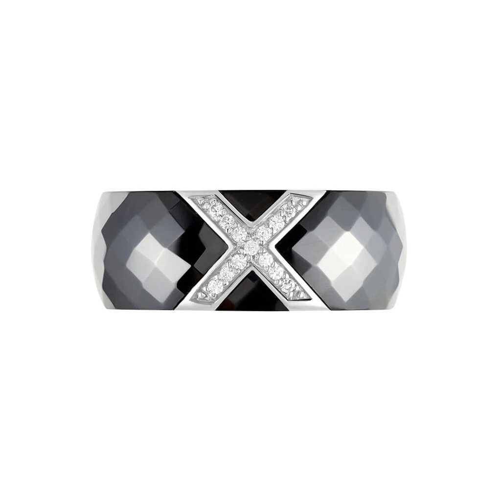 Bague Argent Blanc 925/1000 Ceramique Noire Forme X Oxydes De Zirconium