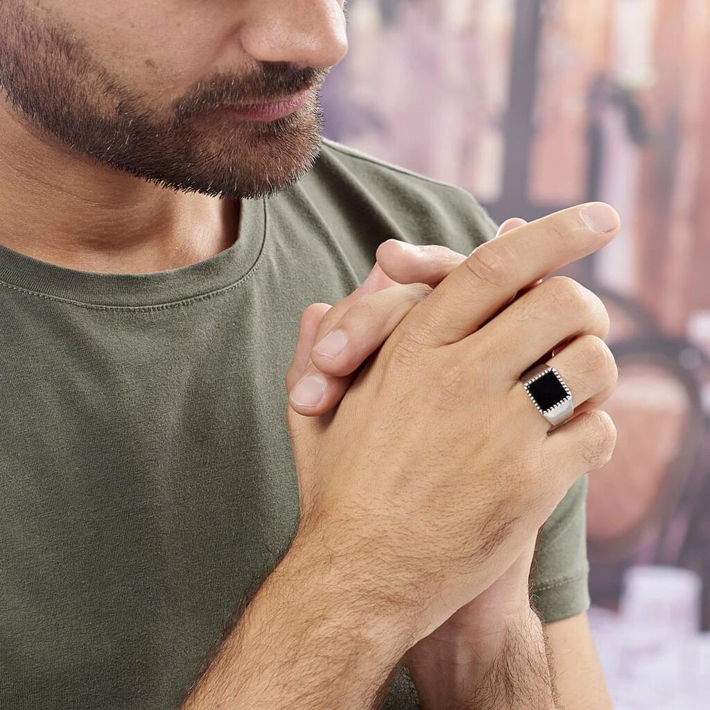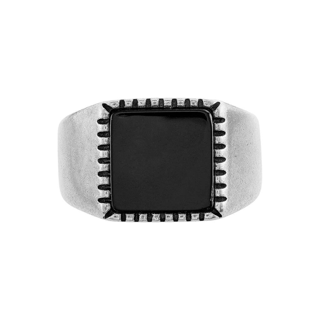 Bague Acier Gris Avec Pierre Agate Noire Carree Ajustable