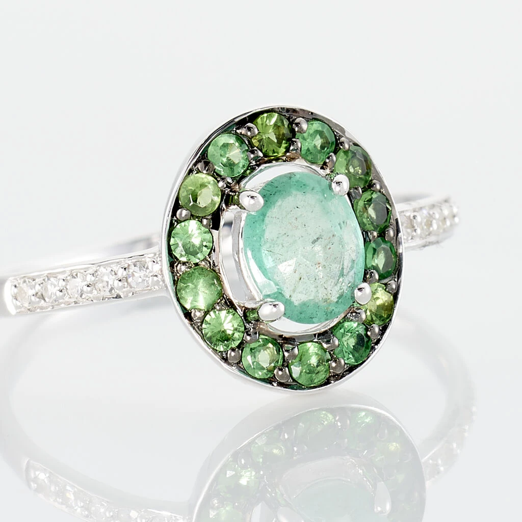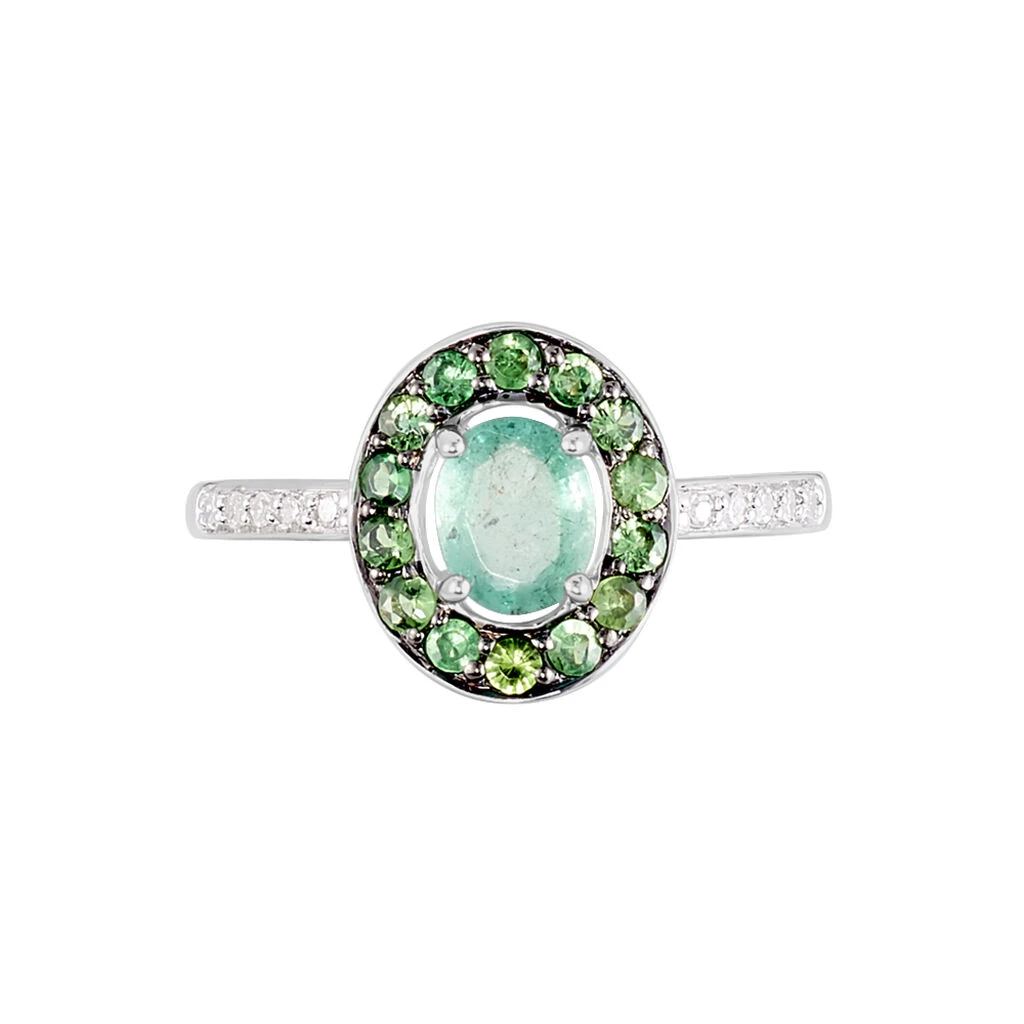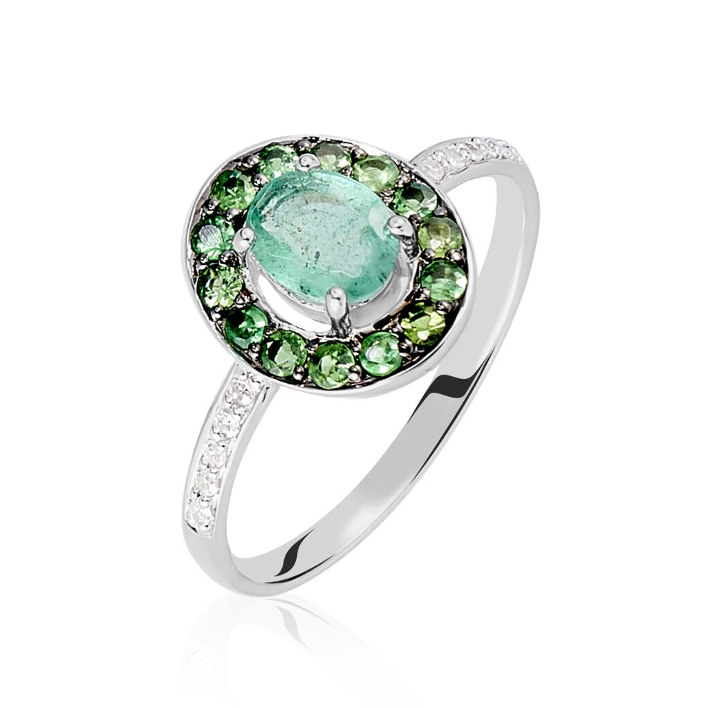 Bague Or Blanc 375/1000 Emeraude Centrale Entourage Tsavorites Corps De Bague Pavage Diamants