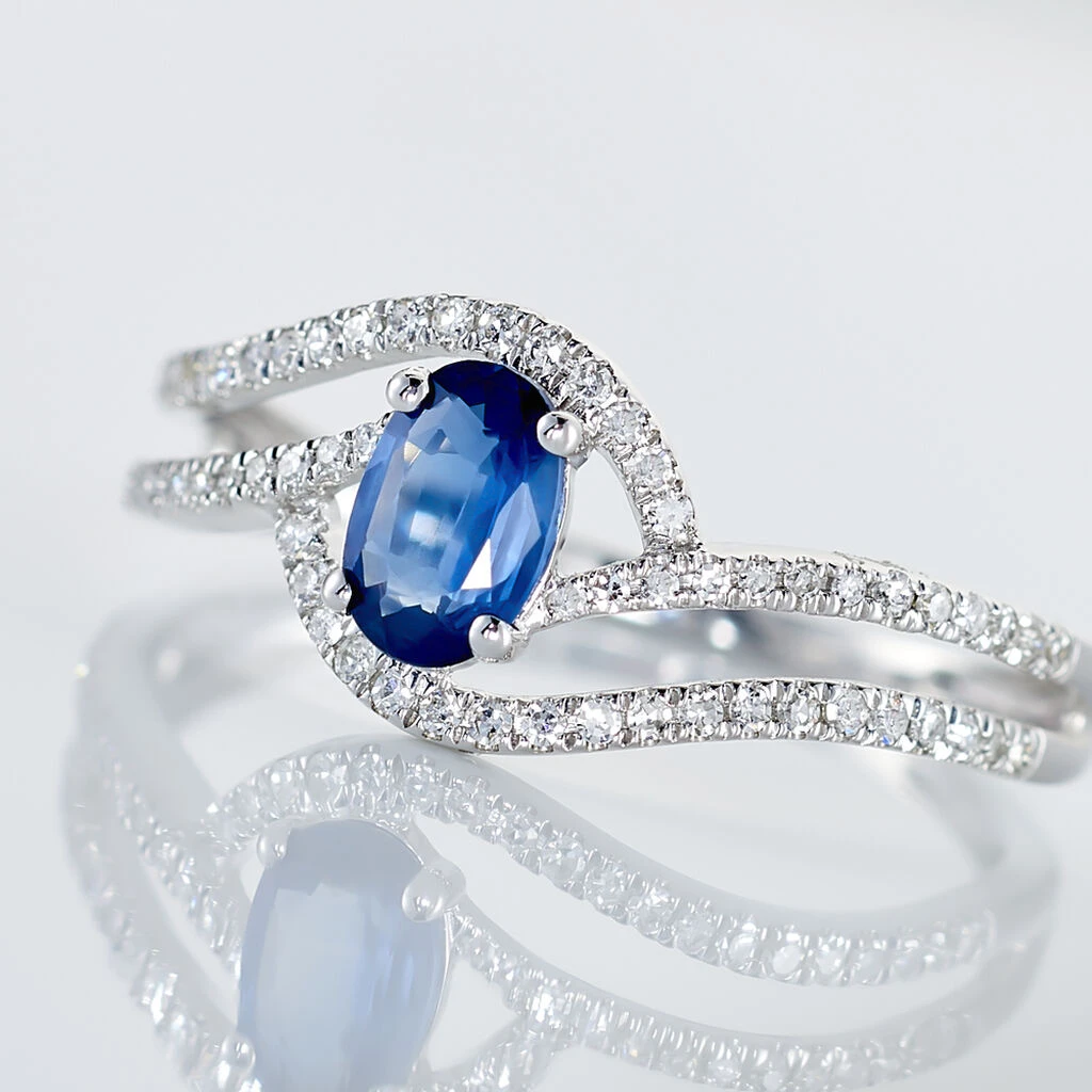Bague Or Blanc 375/1000 Saphir Central Double Vagues Diamants