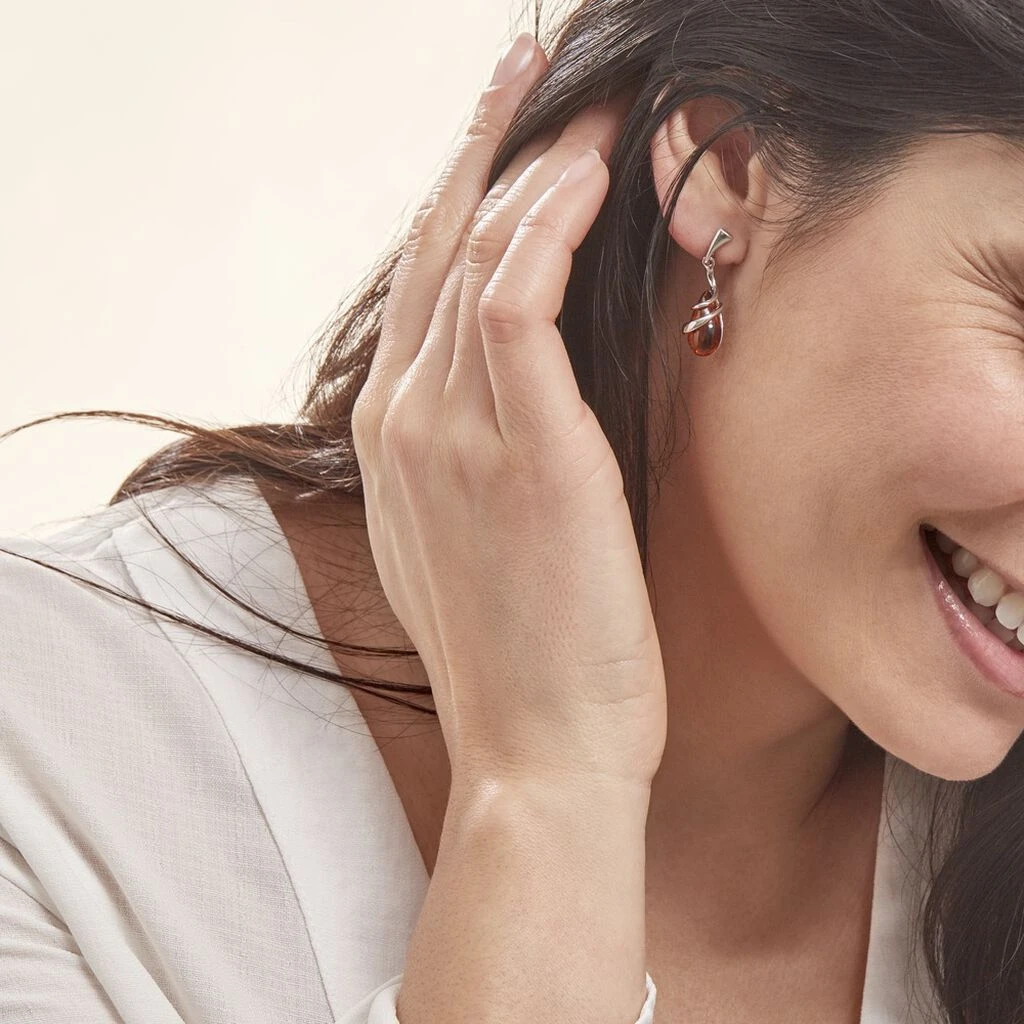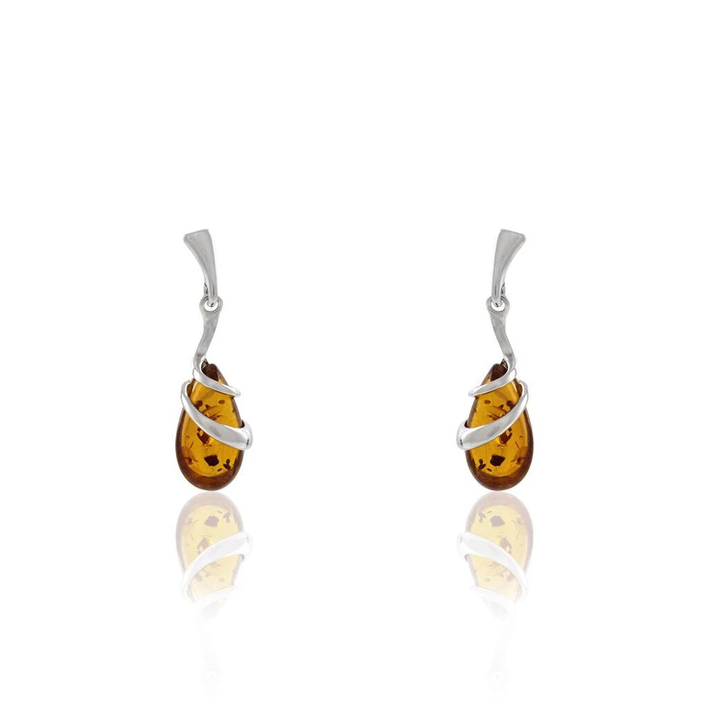 Boucles D’oreilles Pendantes Argent Blanc 925/1000 Avec Ambre Cognac Poire