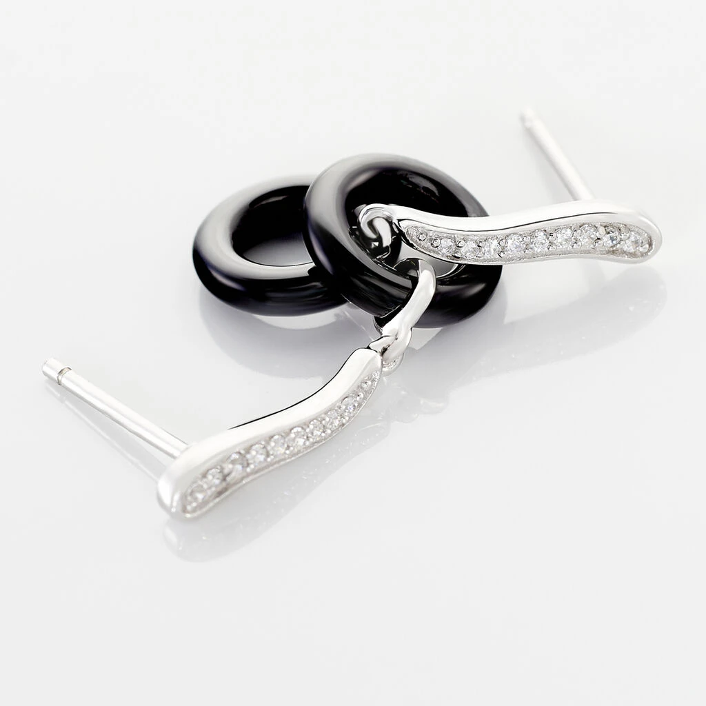 Boucles D’oreilles Pendantes Argent Blanc 925/1000 Mini Cercles Ceramique Noire Et Pavage Oxydes De Zirconium