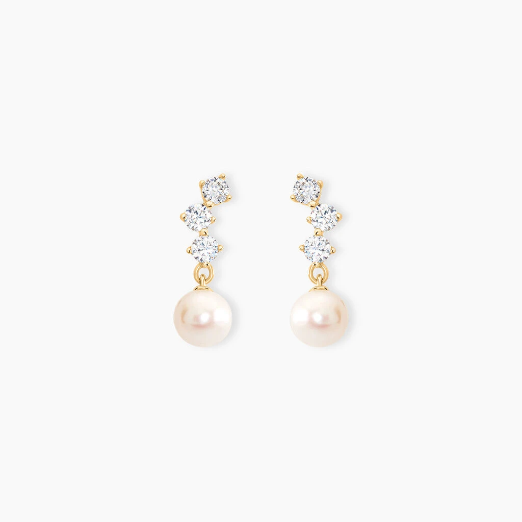 Boucles D’oreilles Or Jaune 375/1000 Pendantes Perles De Cultures Et Oxydes De Zirconium