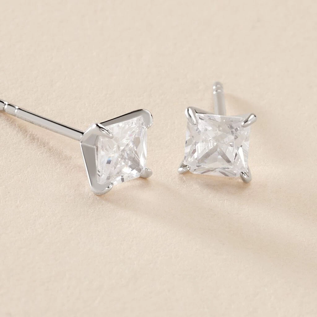 Boucles D’oreilles Puces Argent Blanc 925/1000 Oxyde De Zirconium Carré Serti 4 Griffes 5mm