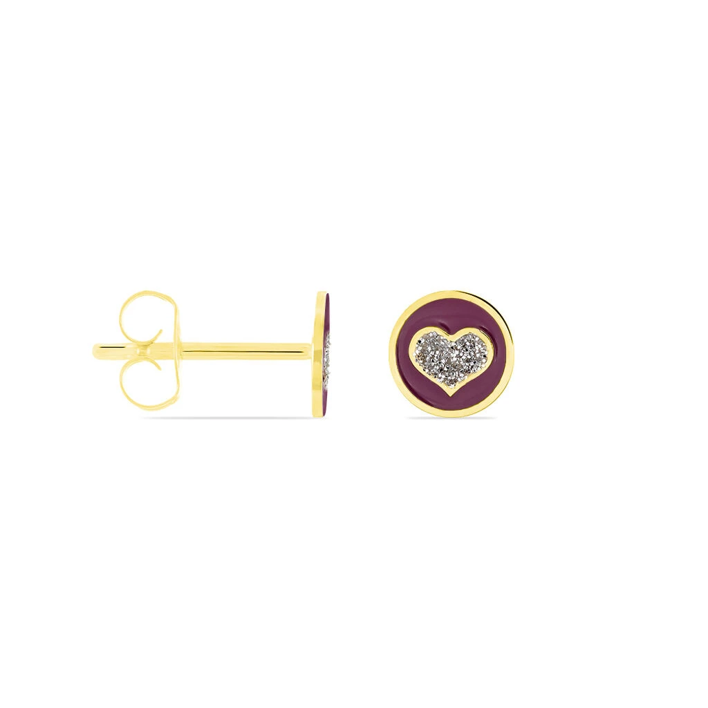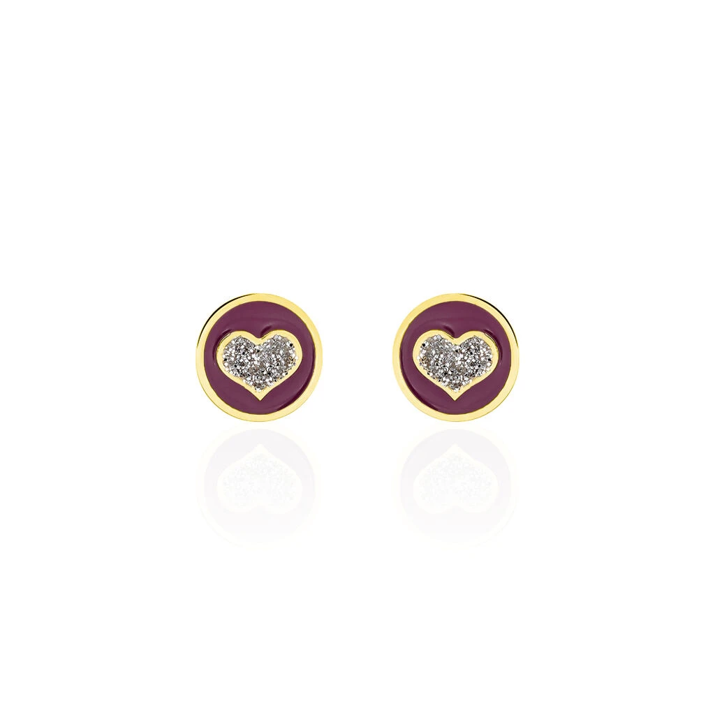 Boucles D’oreilles Or Jaune 375/1000 Puces Pastilles Smalto Violet Cœurs Glitter Silver
