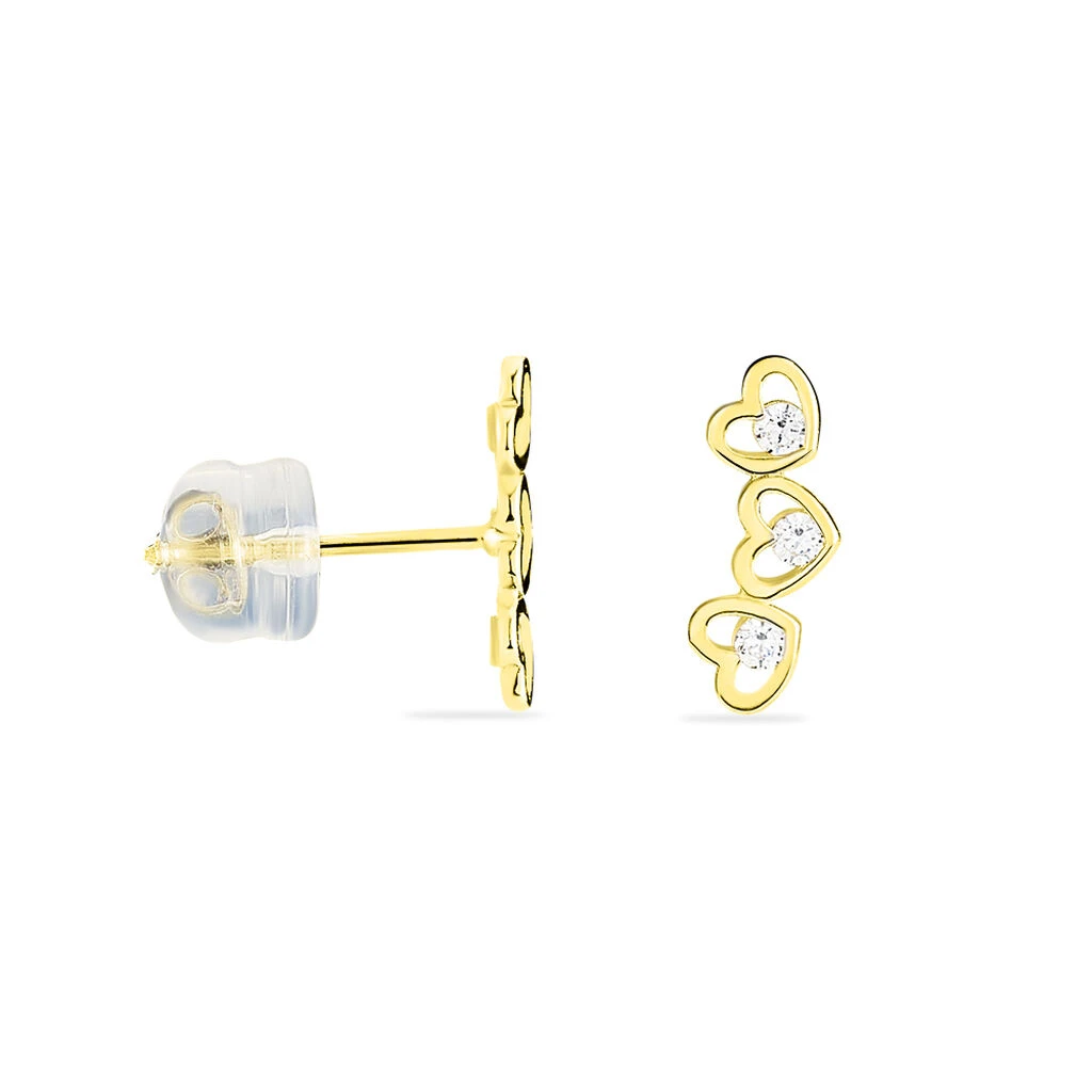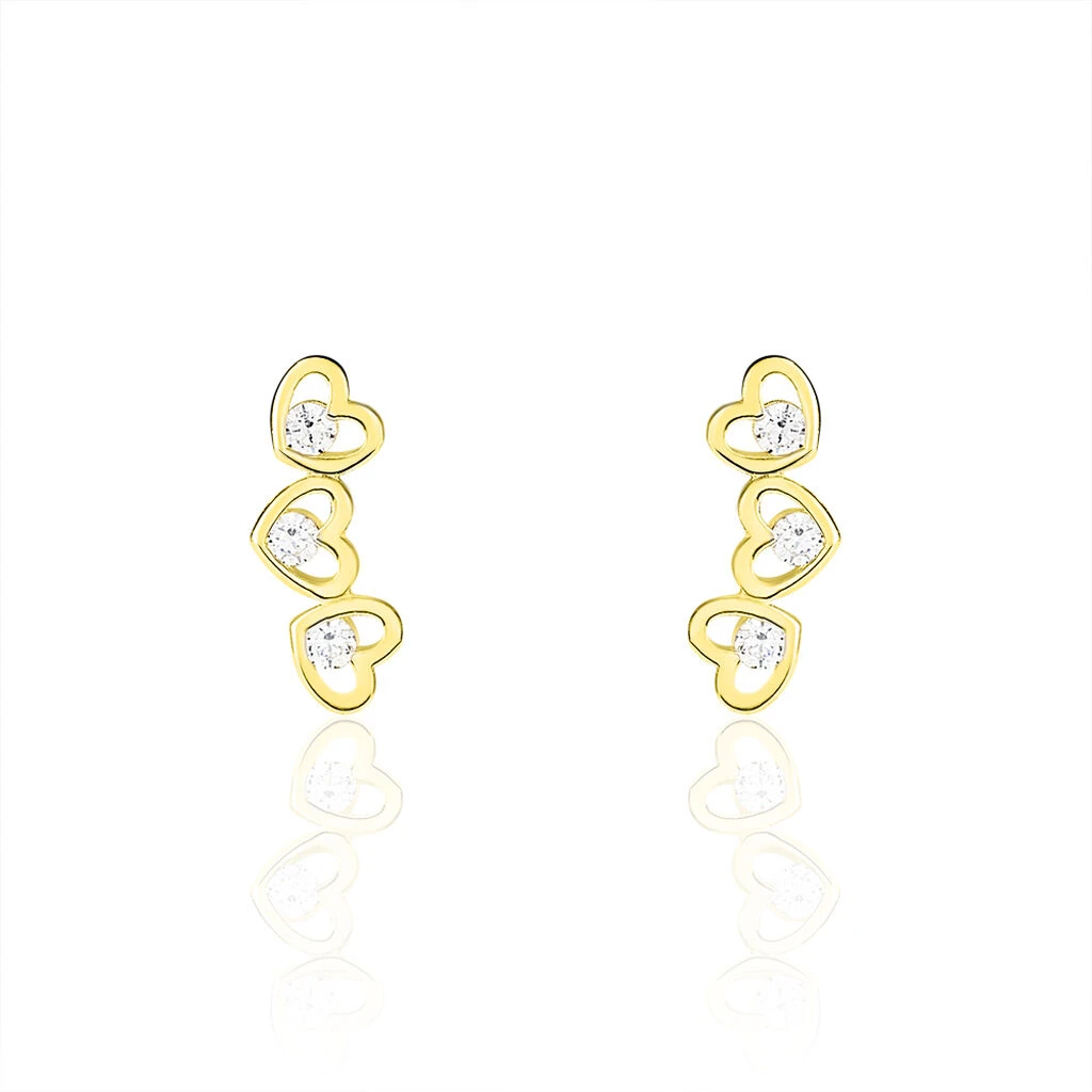 Boucles D’oreilles Or Jaune 375/1000 Puces Triples Cœurs Ajoures + Oxydes De Zirconium