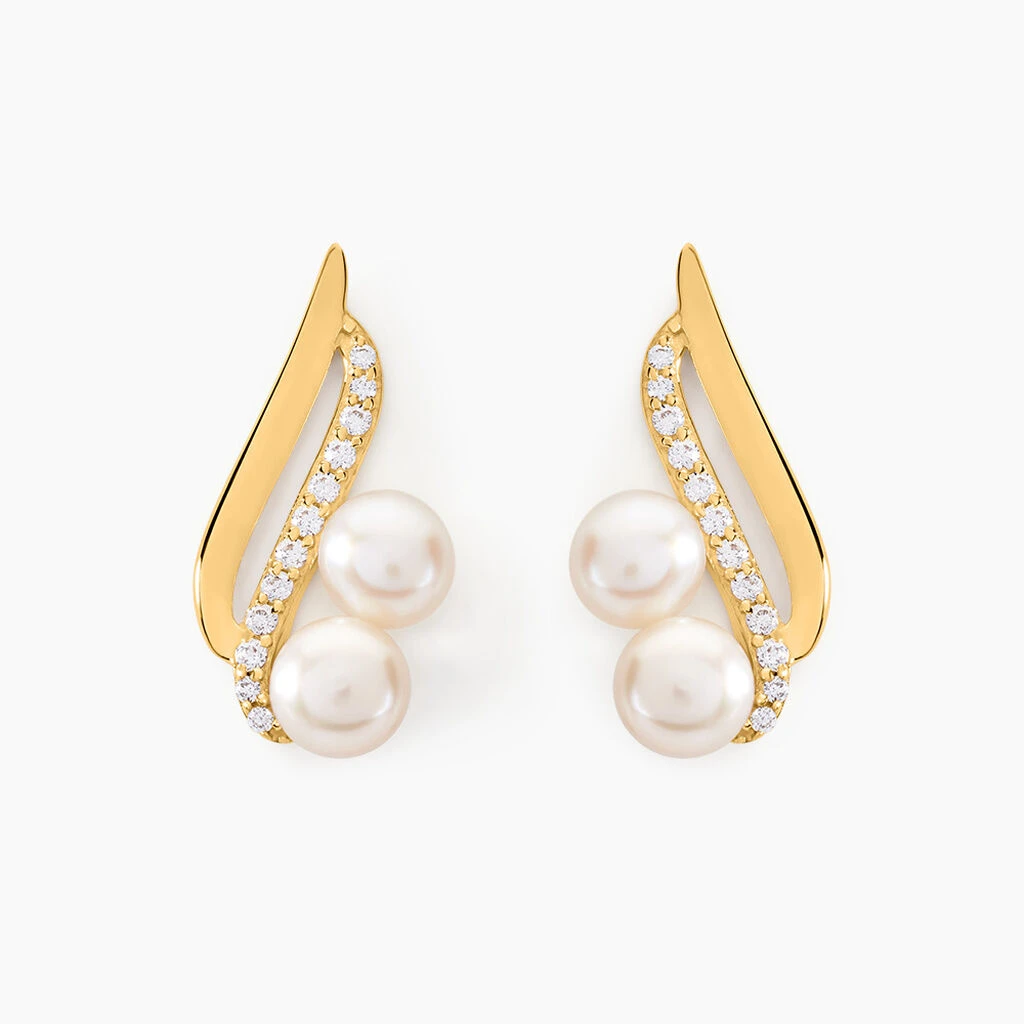 Boucles D’oreilles Or Jaune 375/1000 Formes Vagues Perles De Culture 4mm Et Oxydes De Zirconium