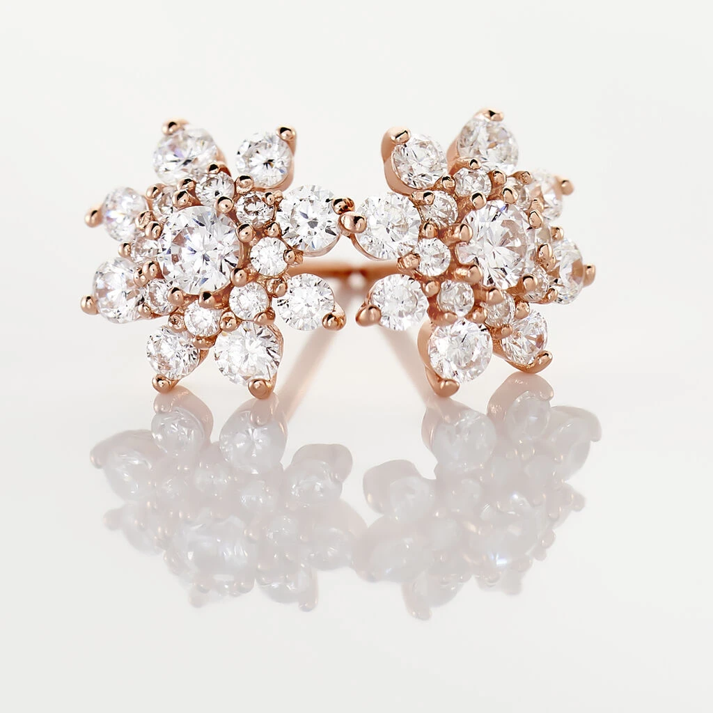 Boucles D’oreilles Puces Argent Rose 925/1000 Motifs Fleurs Pavage Oxydes De Zirconium