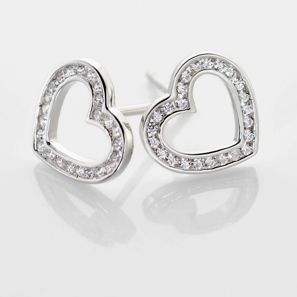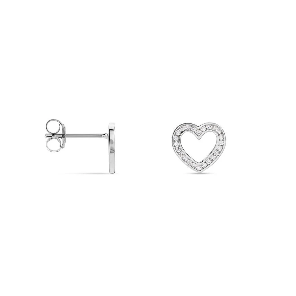 Boucles D’oreilles Puces Argent Blanc 925/1000 Coeurs Ajoures Sertis Rail Oxydes De Zirconium