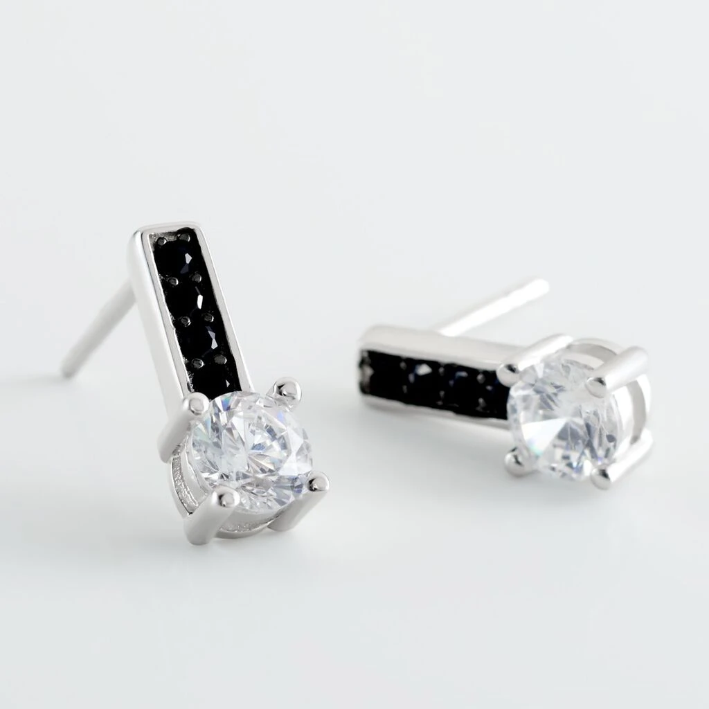 Boucles D’oreilles Puces Argent 925/1000 Sertis Griffes Oxyde De Zirconium 5mm Et Barrette Pavage Oxydes Noirs