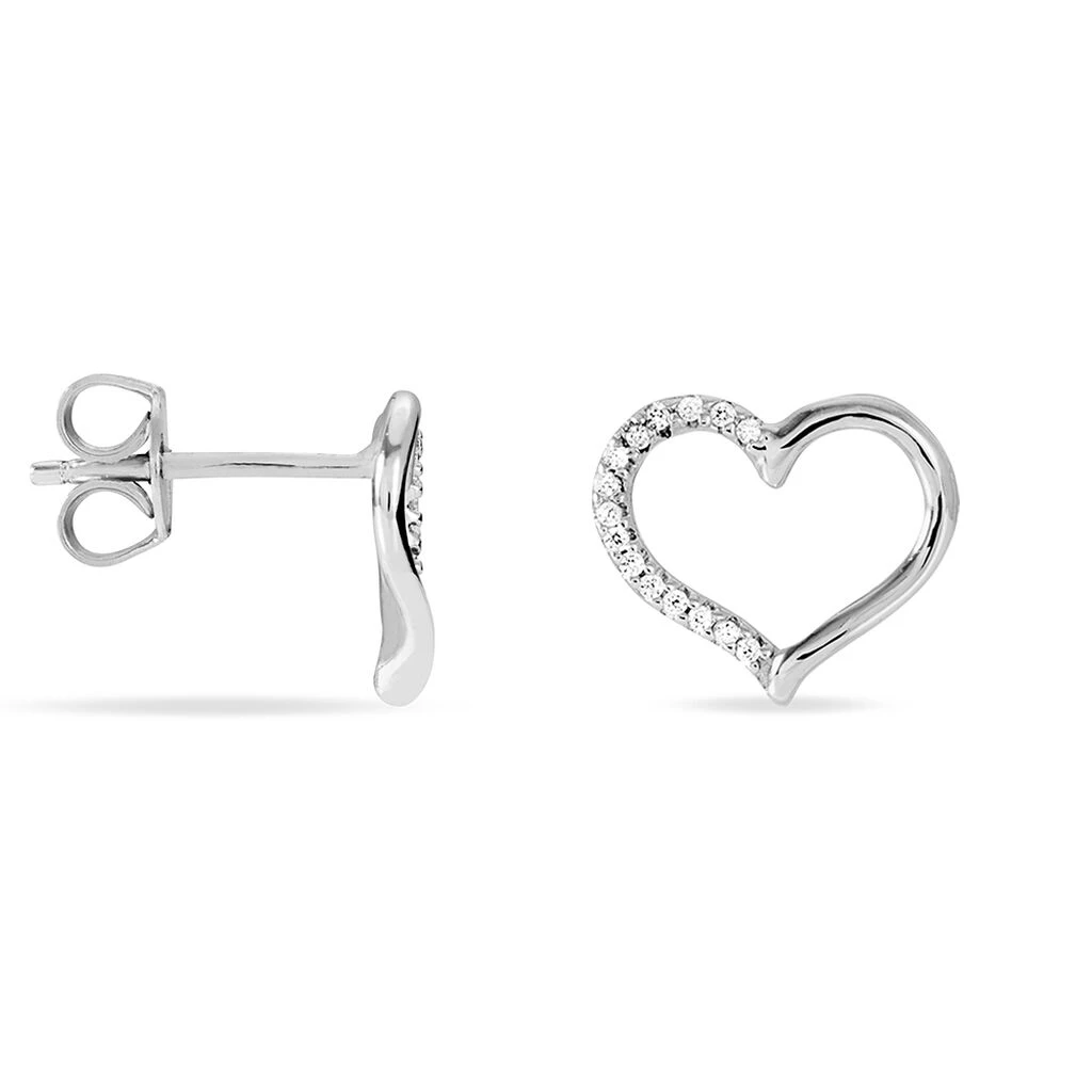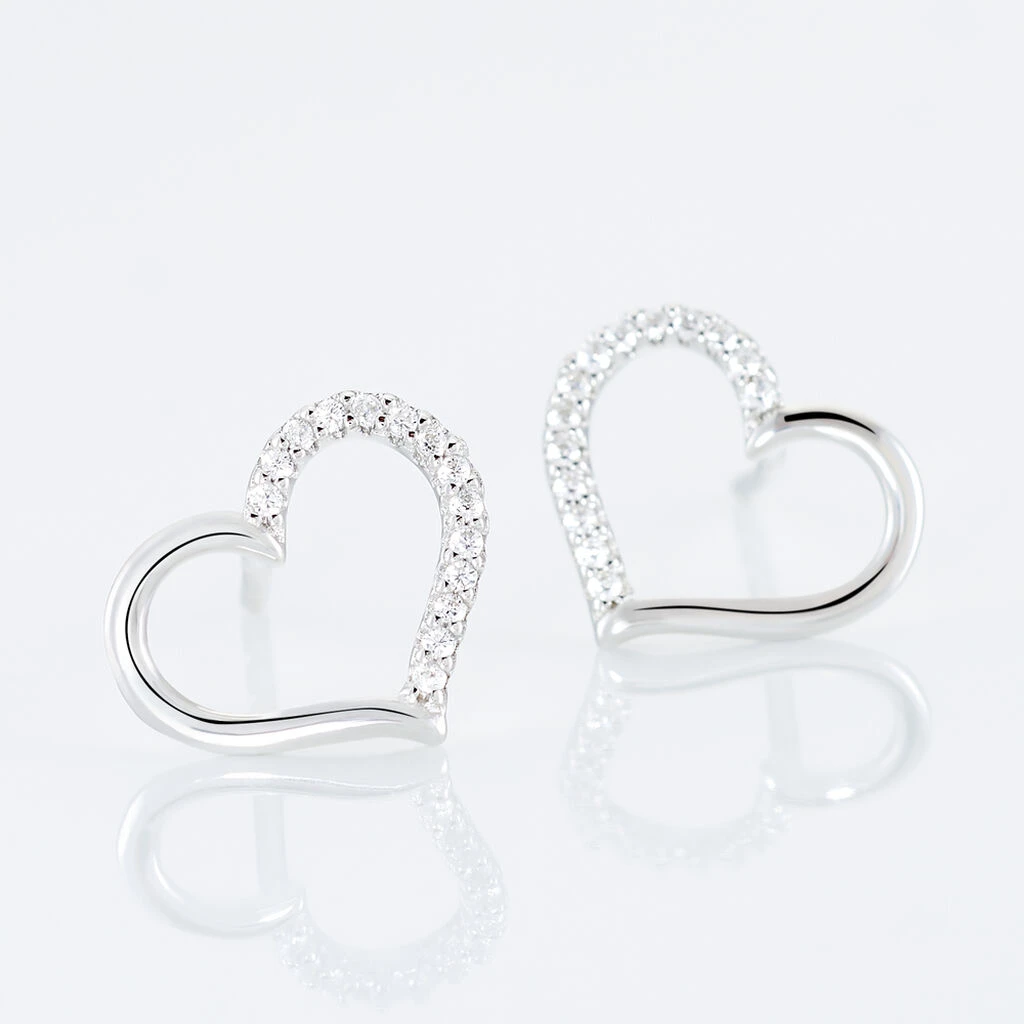Boucles D’oreilles Puces Argent Blanc 925/1000 Oxydes De Zirconium Forme Coeur 1/2 Cote Pave