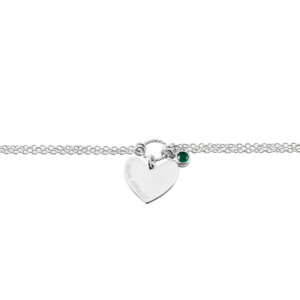 Bracelet Argent 925/1000 Coeur Gravure Je T’aime Pampille Onyx Vert Double Chaines Maille Forçat 18.5cm