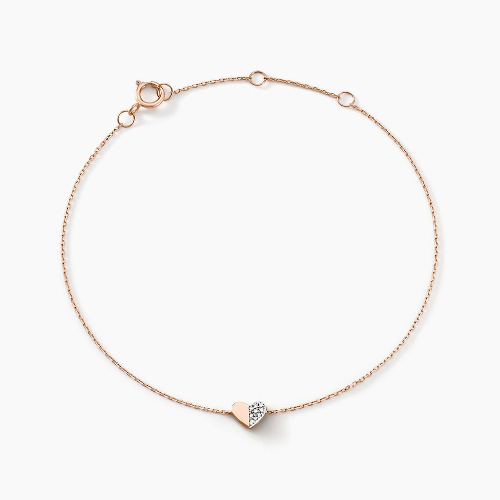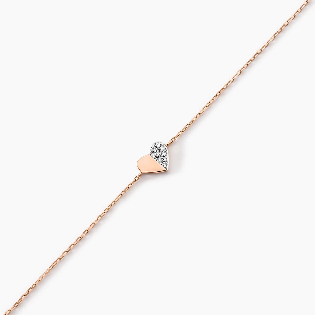 Bracelet Or Rose 375/1000 Motif Cœur + Pavage Diamants 18.5cm