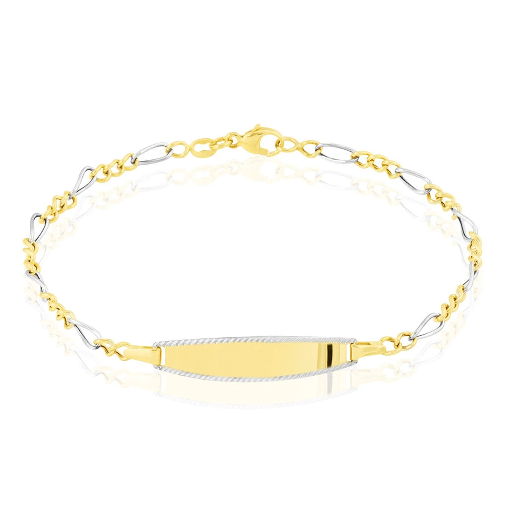 Bracelet Identite Bebe Or Bicolore 375/1000 Plaque Ovale Ciselee Maille Alternee 1/3 15cm