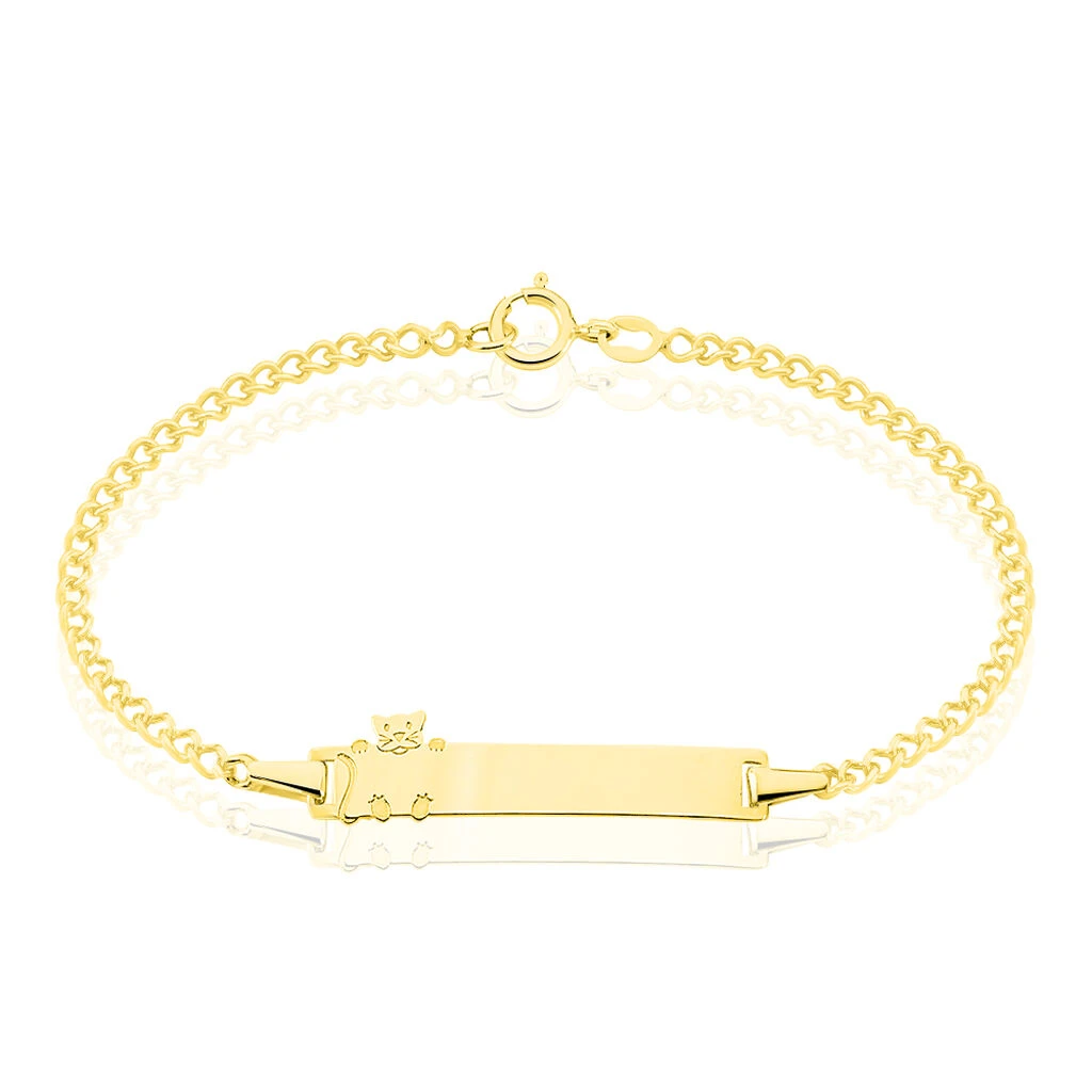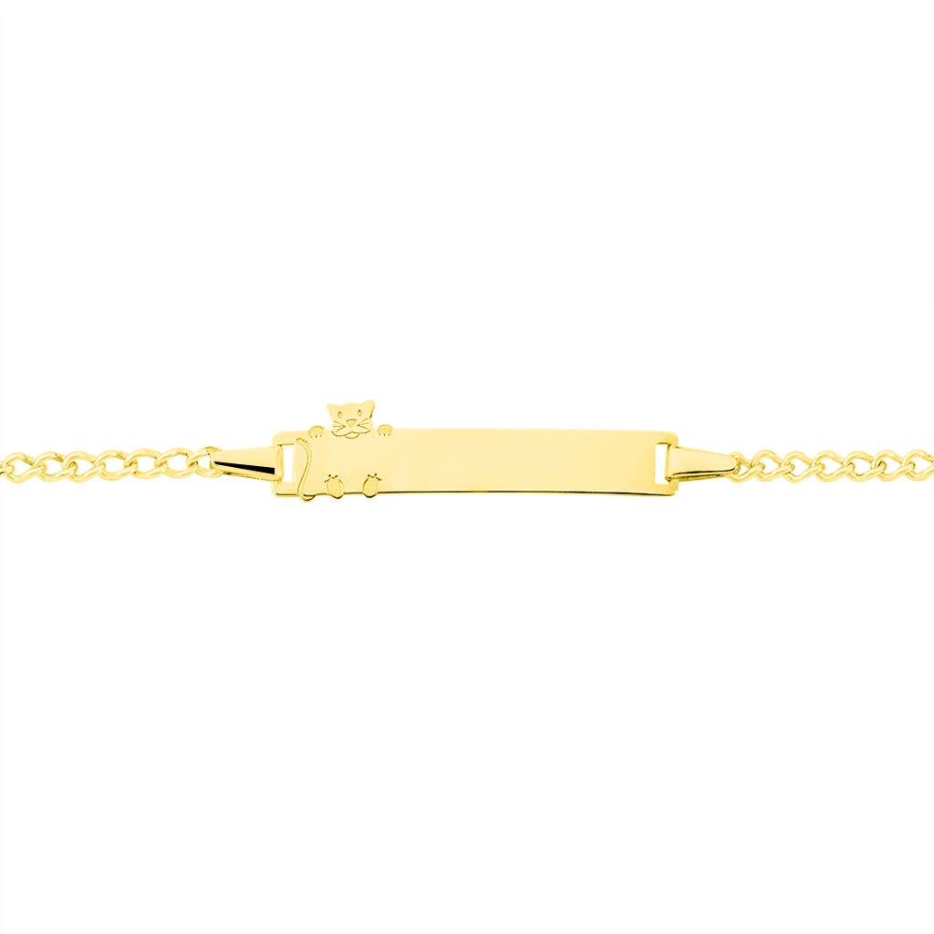 Bracelet Identite Bebe Or Jaune 375/1000 Plaque Rectangle Motif Chat Maille Gourmette 12/14cm