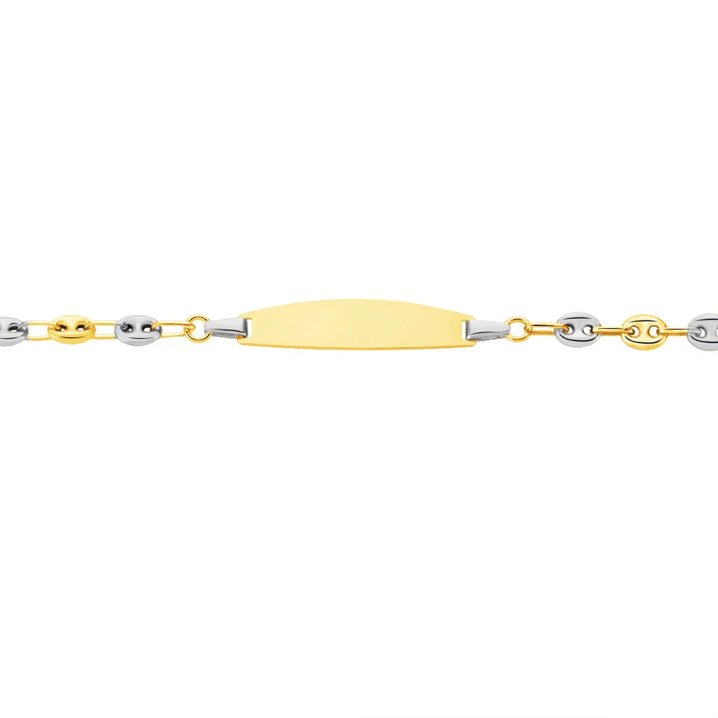 Bracelet Identite Bebe Or Bicolore 375/1000 Plaque Ovale Maille Grain De Cafe 3mm 13/15cm
