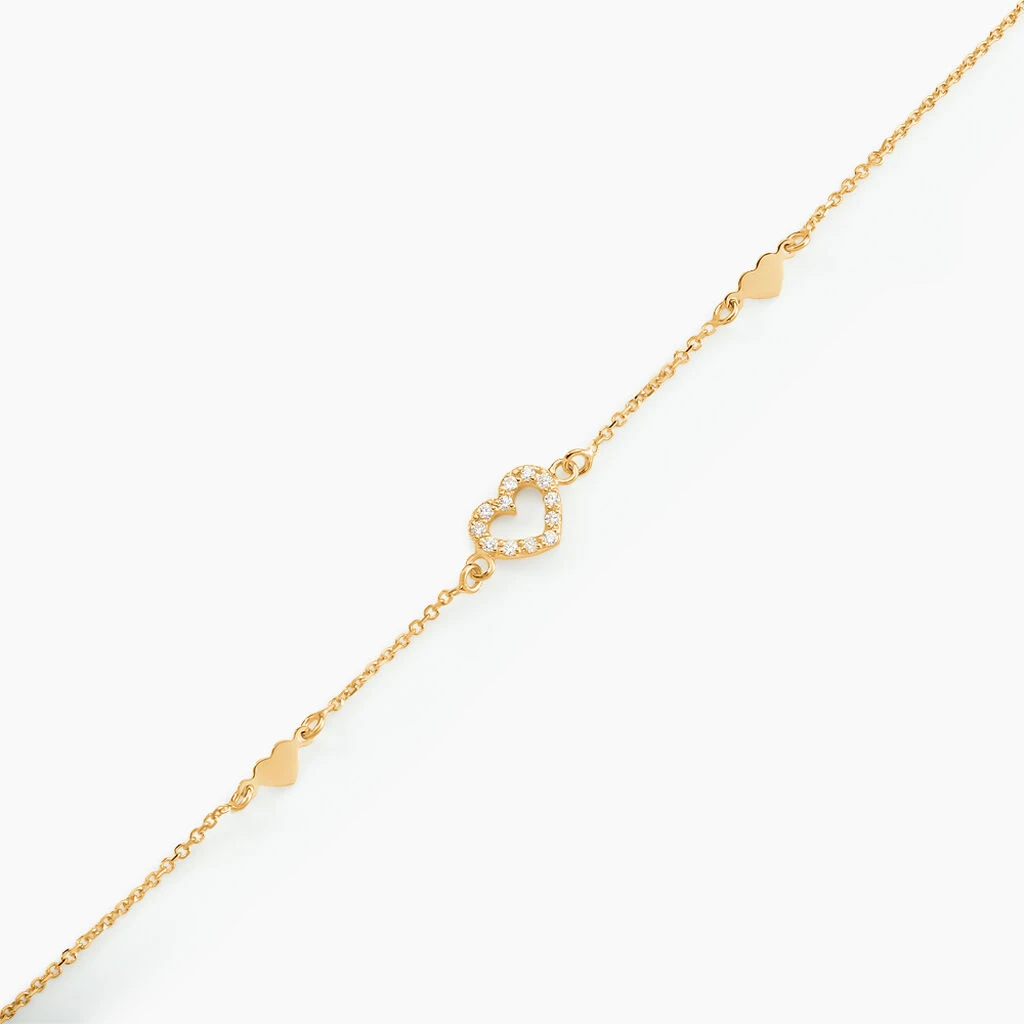 Bracelet Or Jaune 375/1000 Cœur Ajoure Oxydes De Zirconium Et Double Cœurs Pleins 18cm
