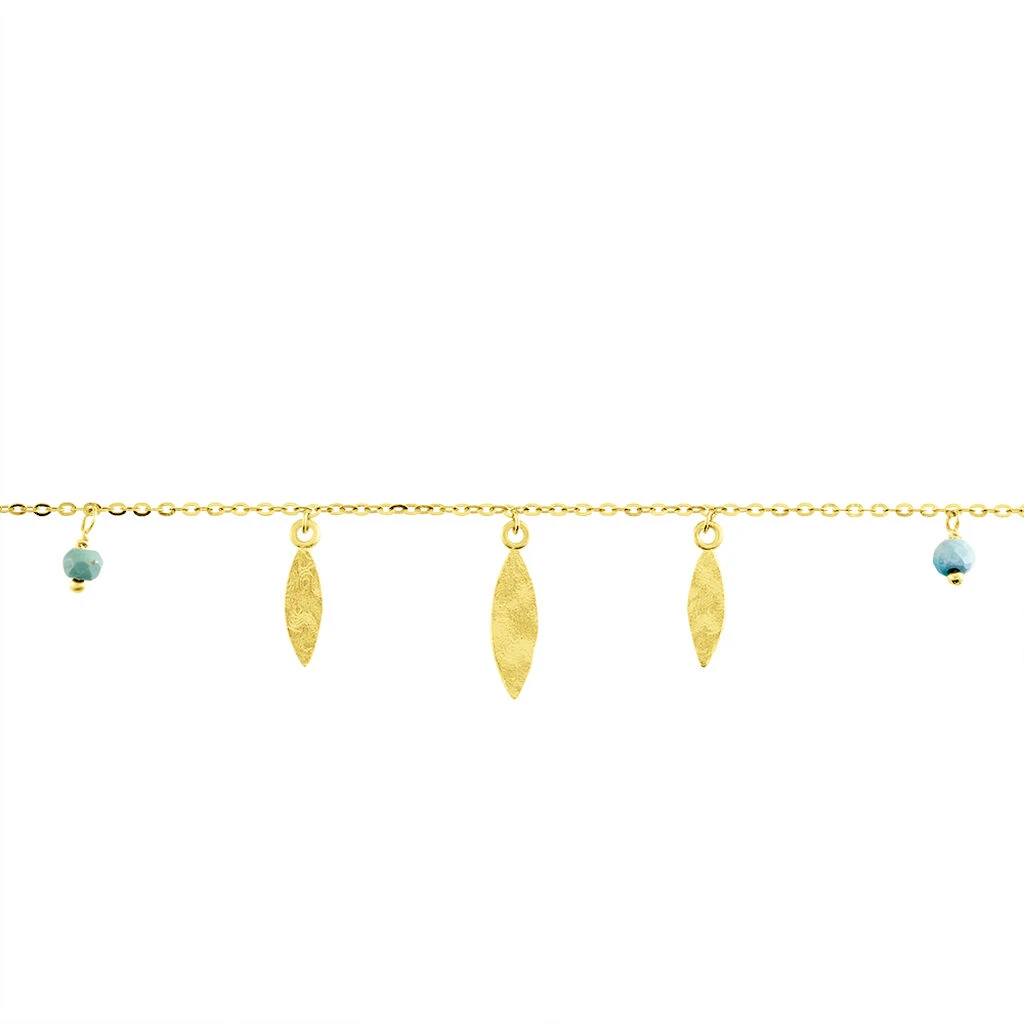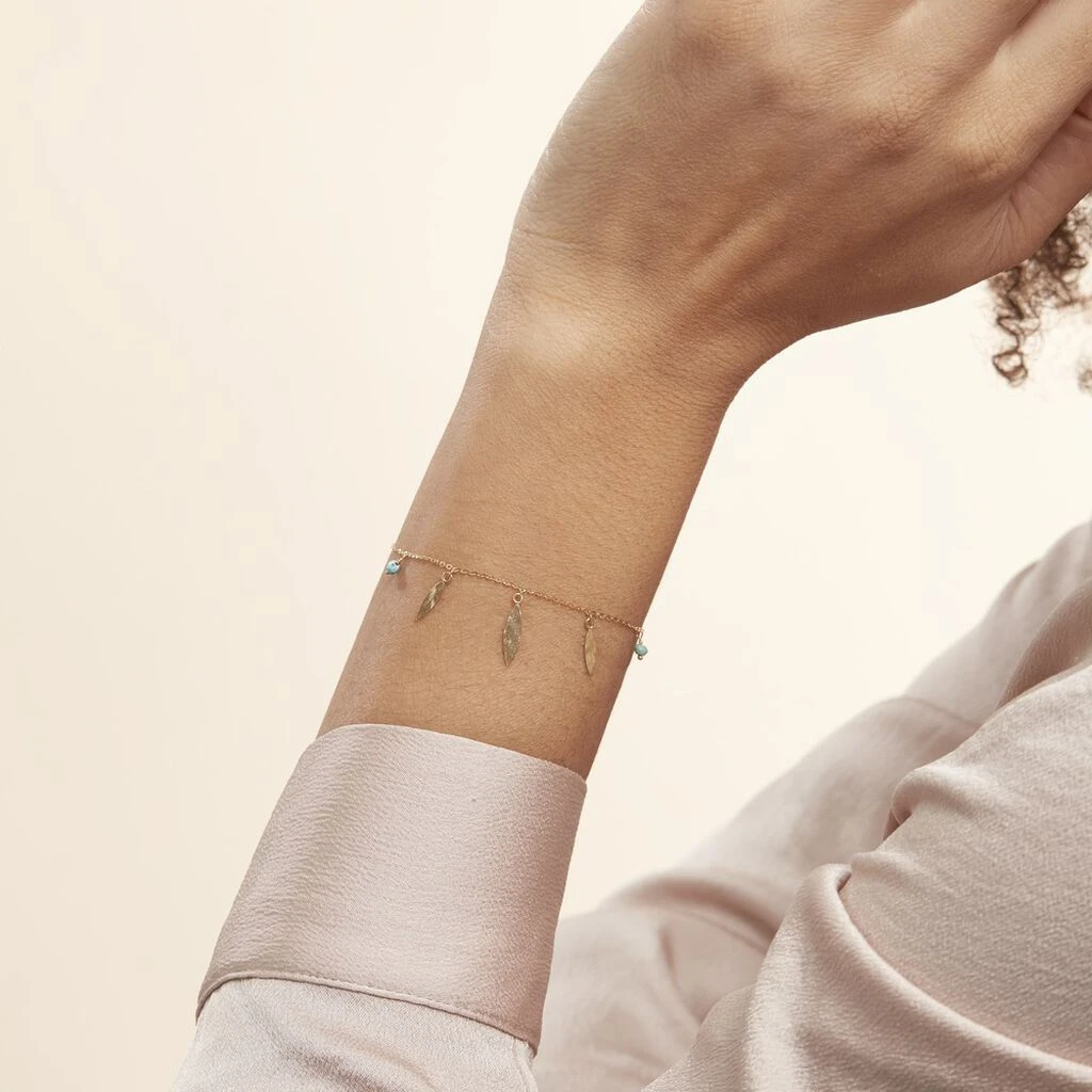 Bracelet Or Jaune 375/1000 Plumes Et Turquoise Maille Jaseron 16+2cm