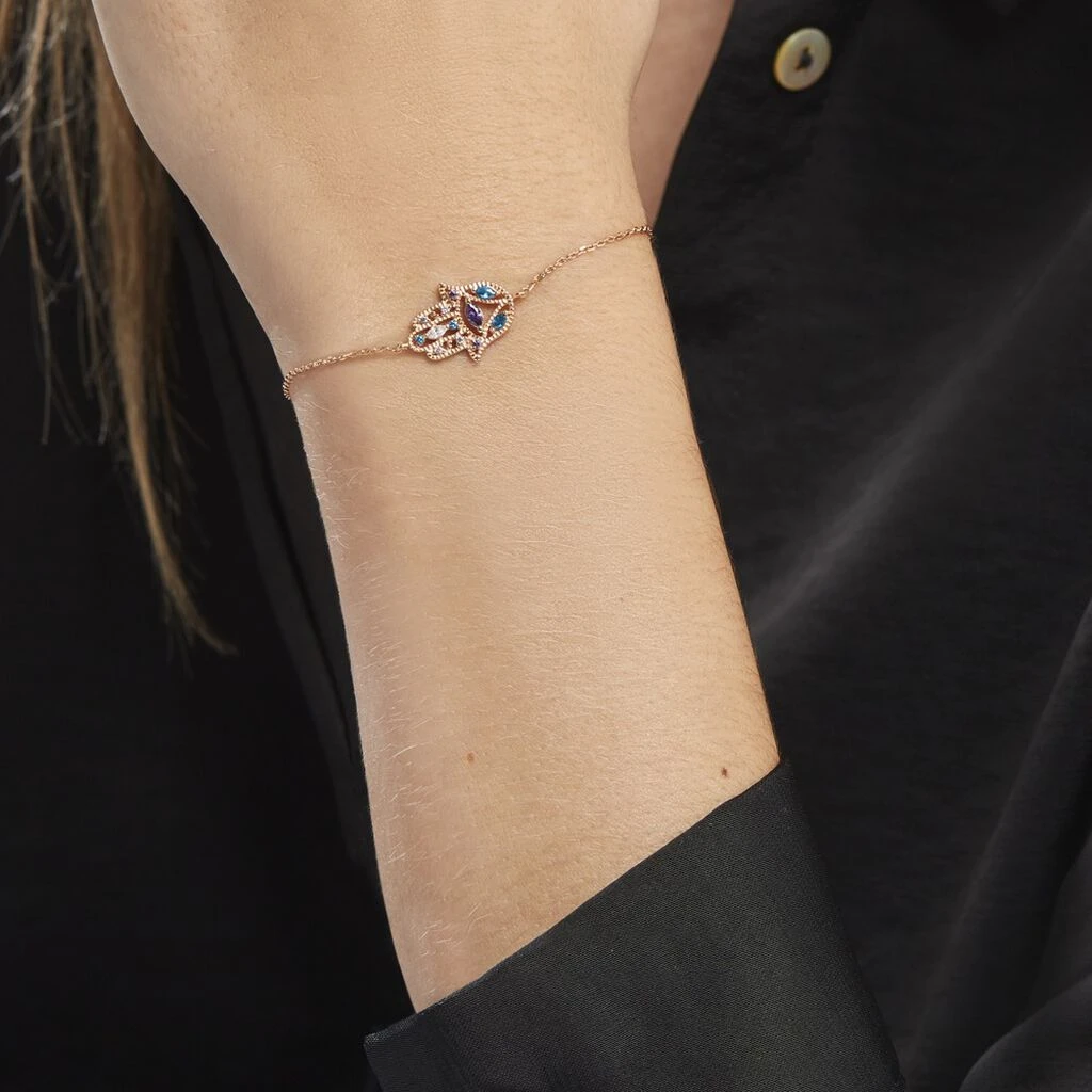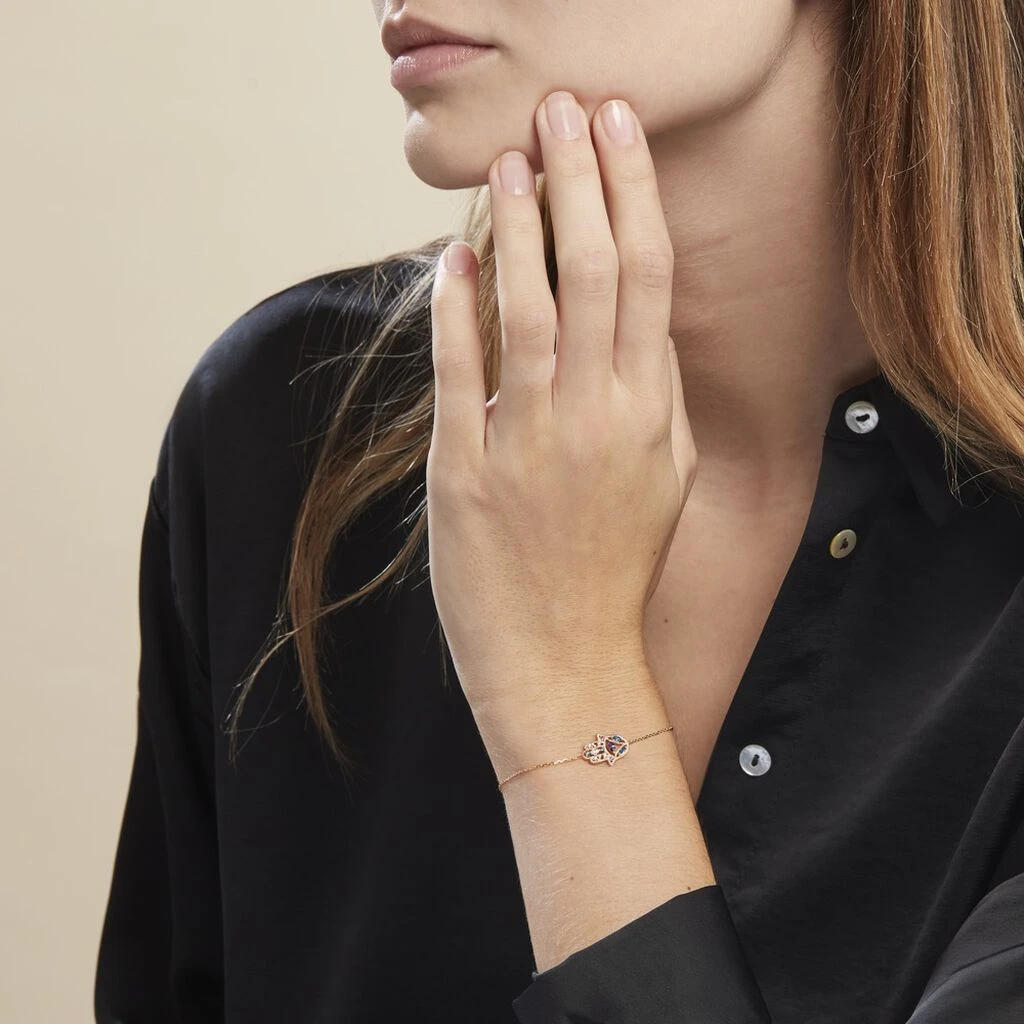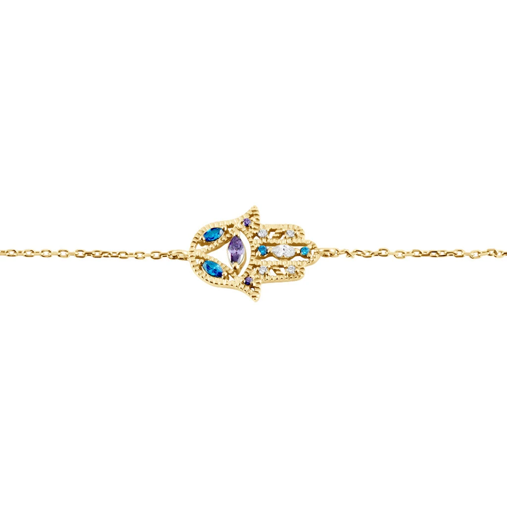 Bracelet Plaqué Or Jaune Main De Fatma Oxydes De Zirconium Colorés Maille Forçat 19cm