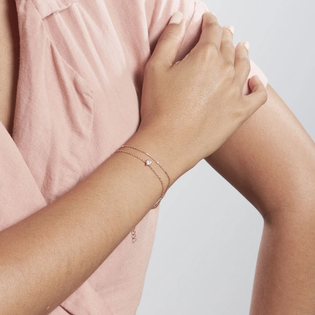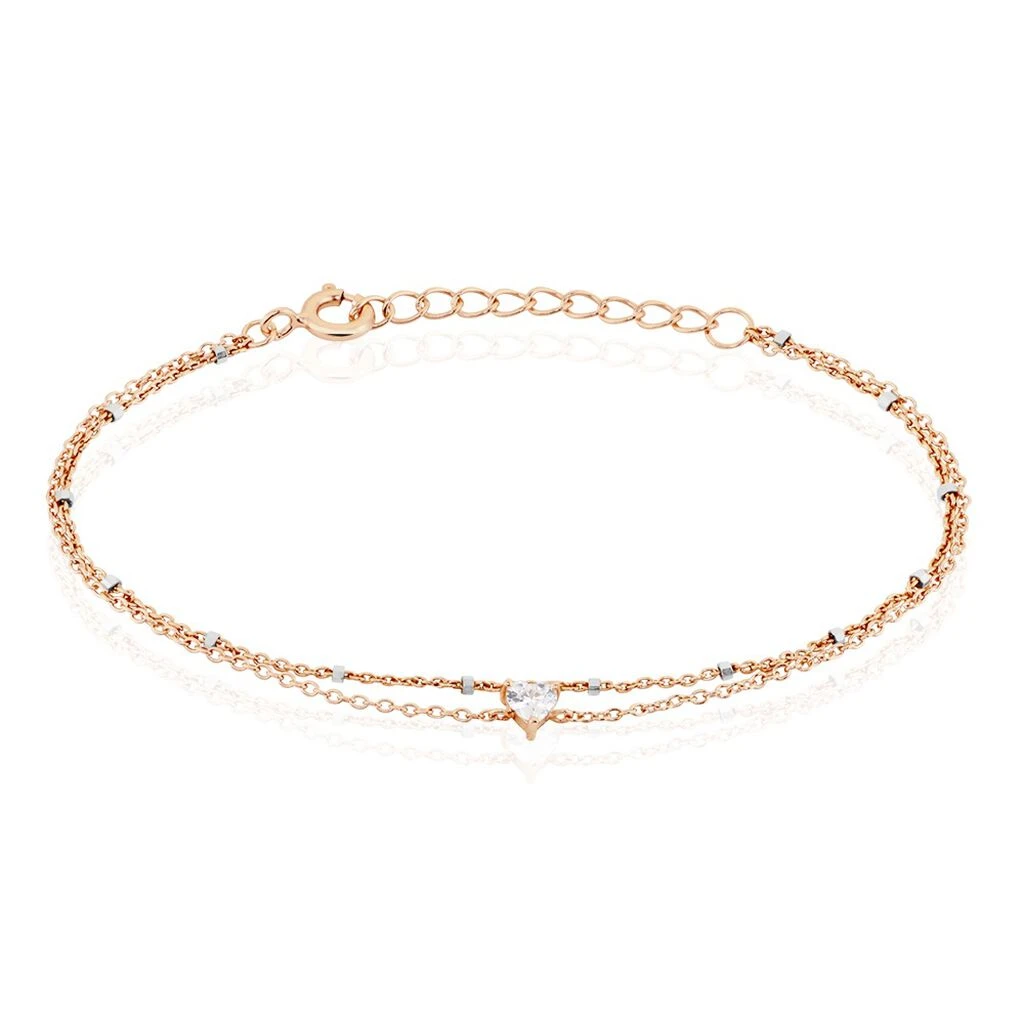 Bracelet Double Chaines Argent Rose 925/1000 Cœur Serti Griffes Oxydes De Zirconium Maille Boules 18.5cm
