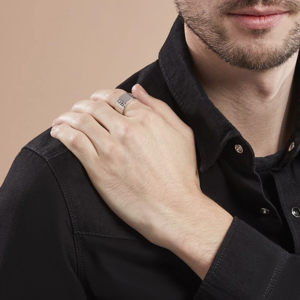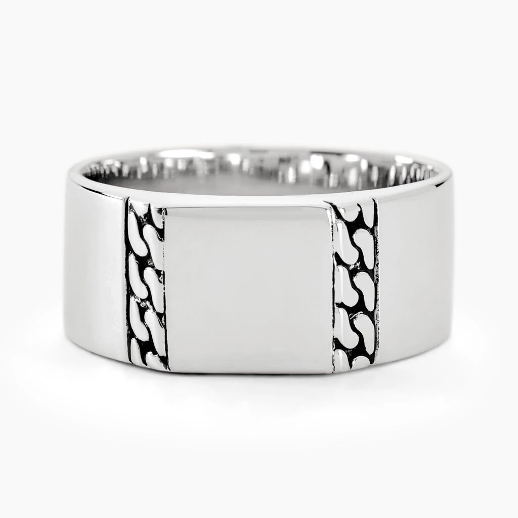 Chevalière Argent Blanc 925/1000 Carré Motifs Maillons