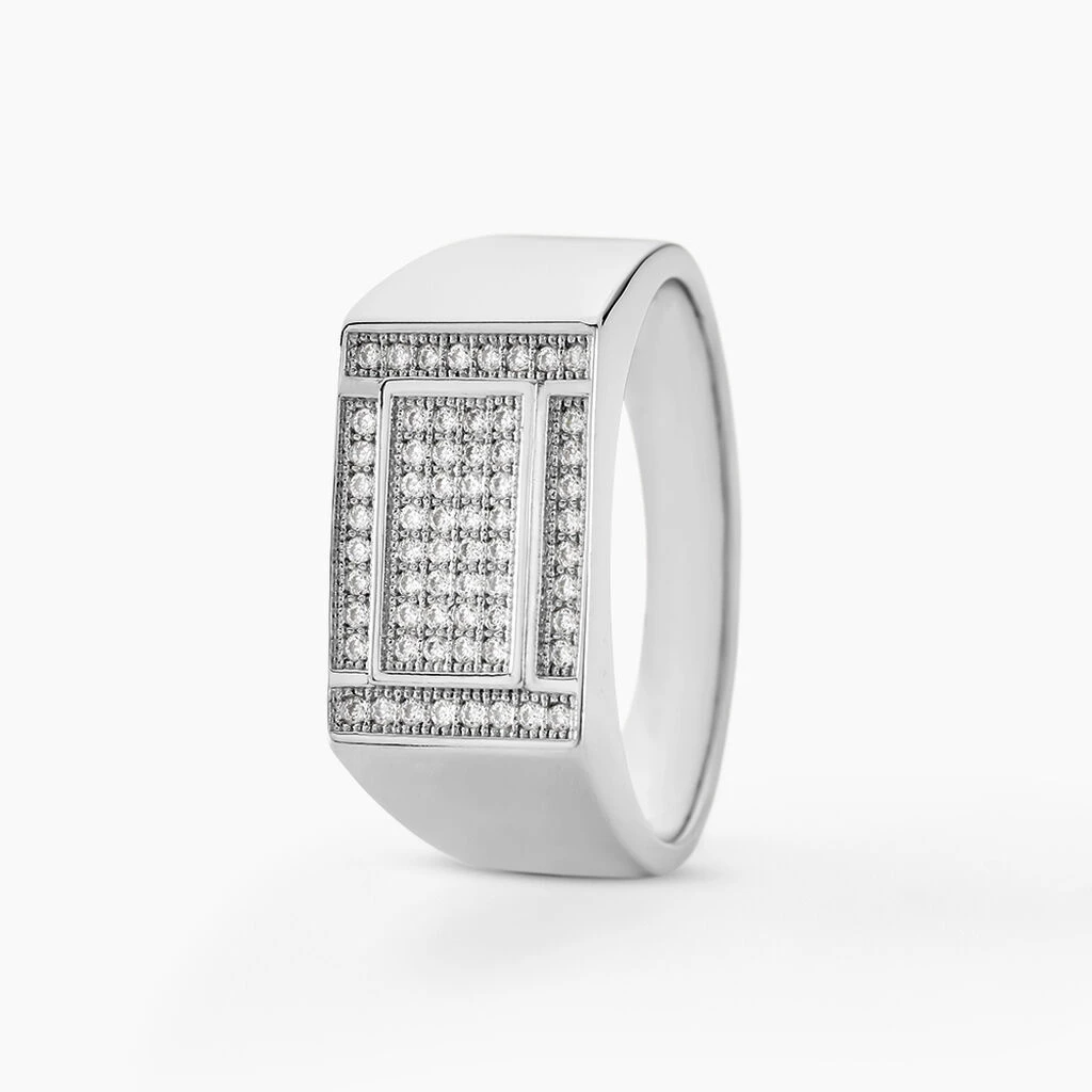 Chevaliere Argent Blanc 925/1000 Plateau Carre Pavage Oxydes De Zirconium Blancs