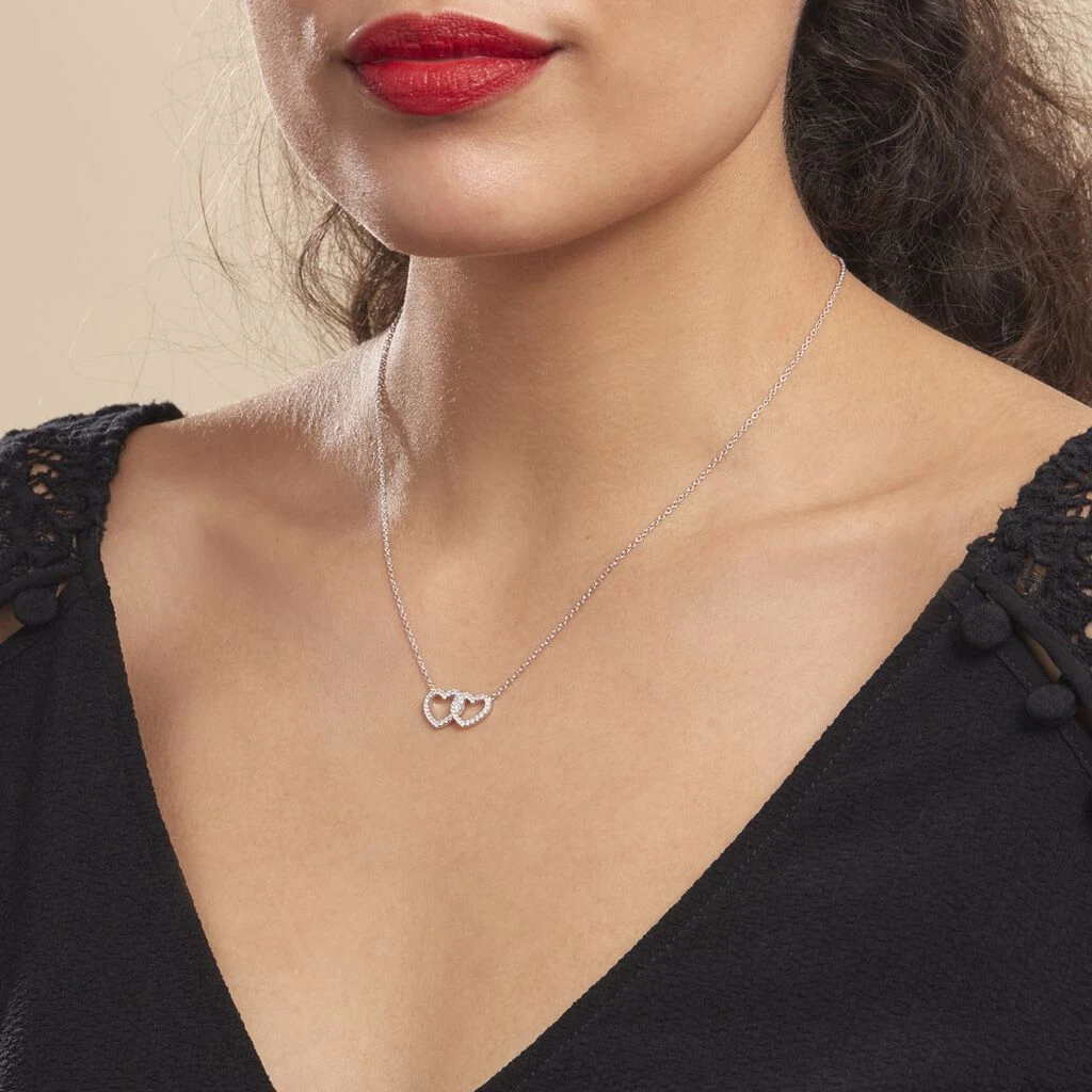 Collier Argent Blanc 925/1000 2 Coeurs Ajoures Entrelaces Pavage Oxydes De Zirconium 45cm