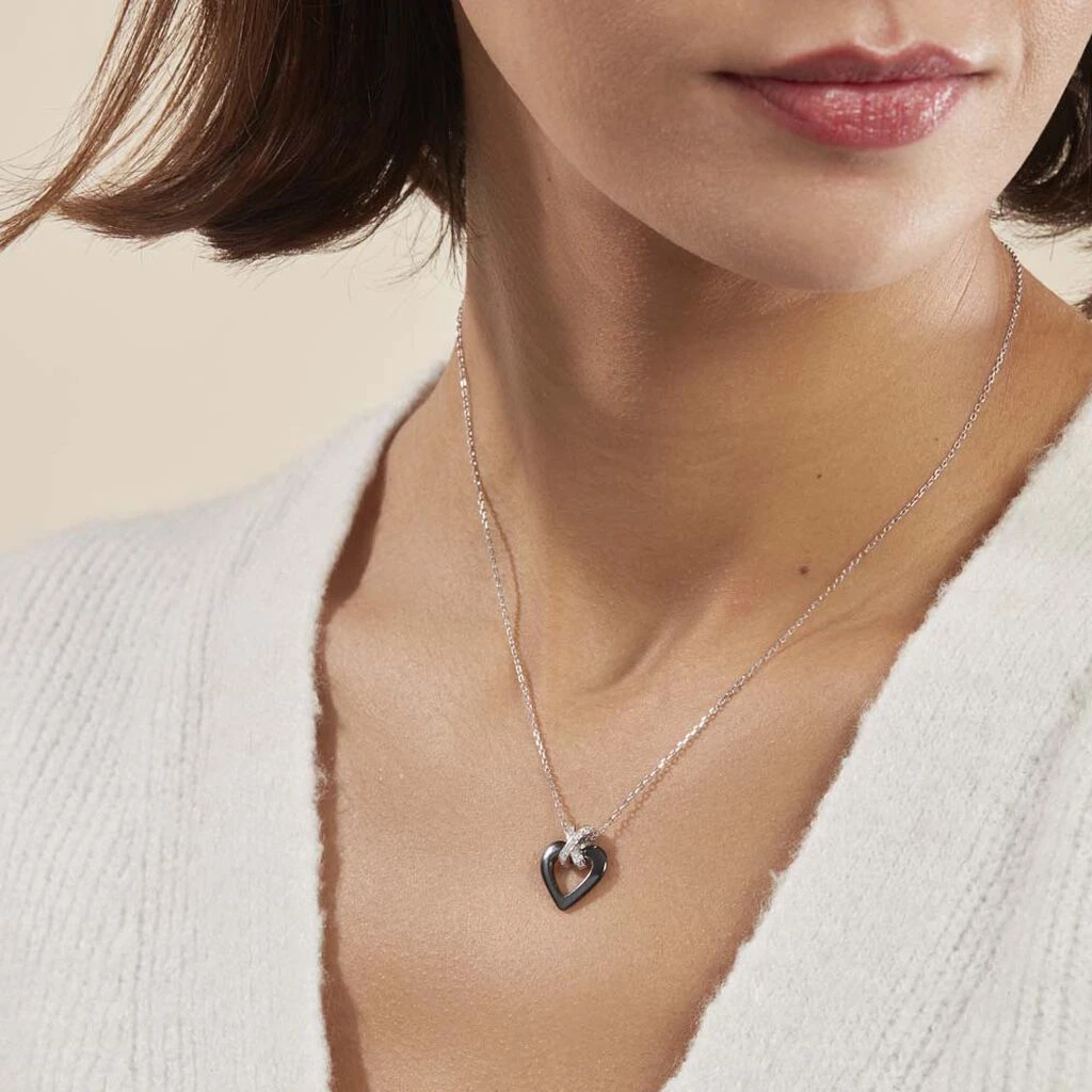 Collier Argent Blanc 925/1000 Ceramique Noire Forme Coeur Croix Pavee Oxydes De Zirconium 42cm