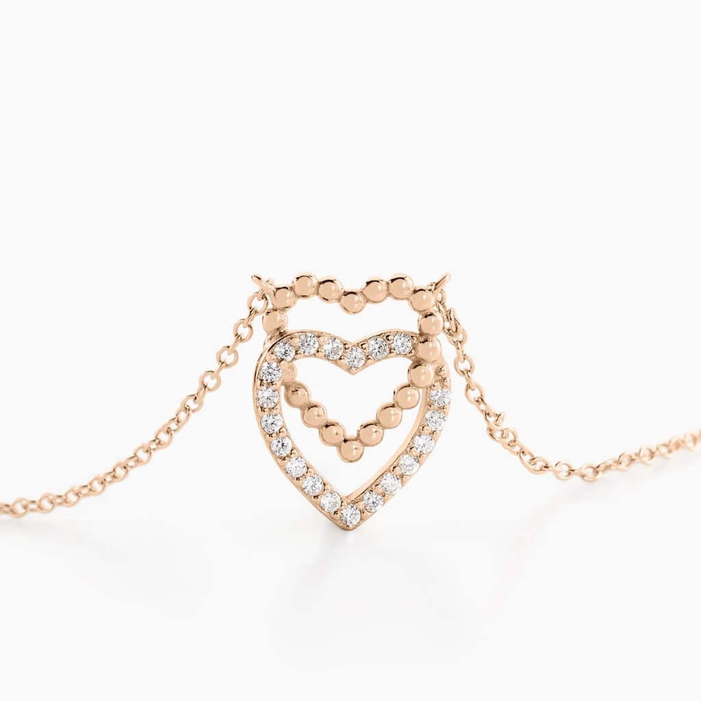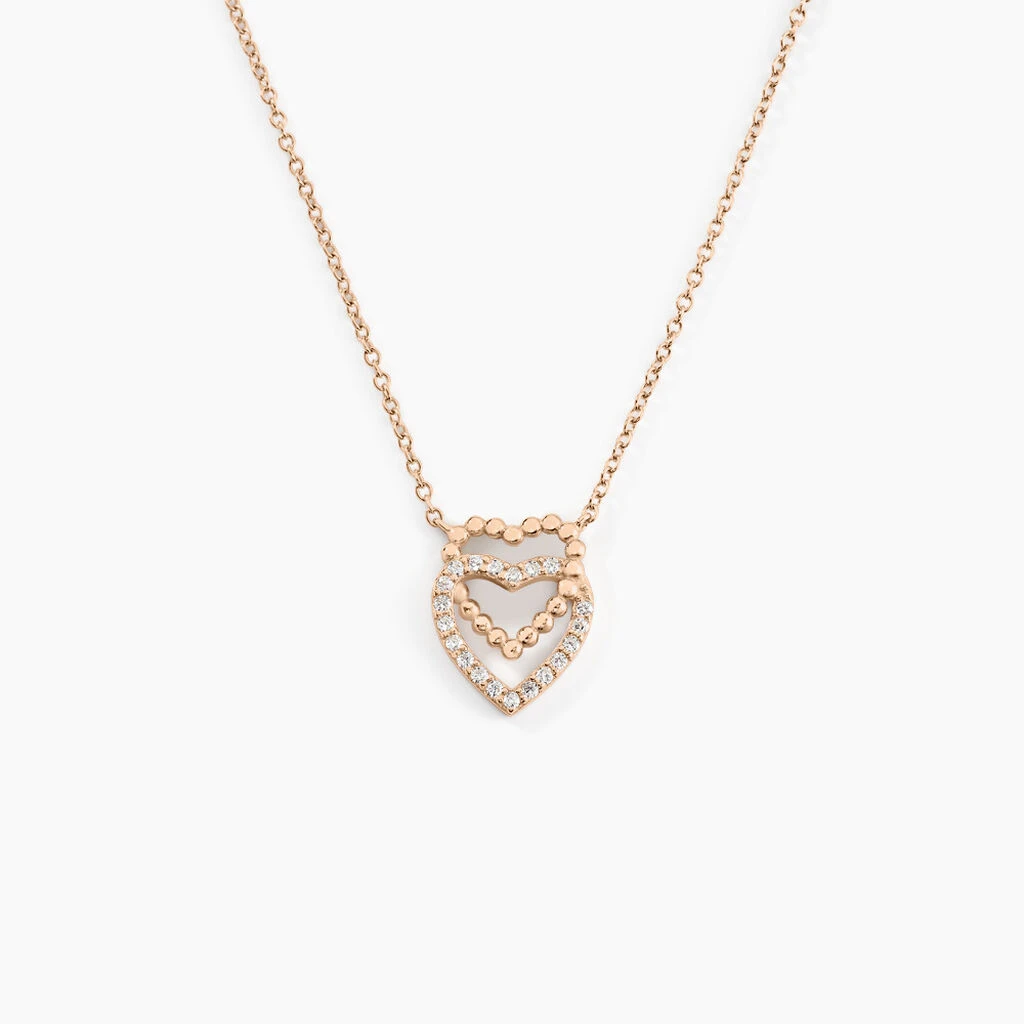 Collier Argent Rose 925/1000 Doubles Cœur Effet Perle Oxydes De Zirconium 45cm