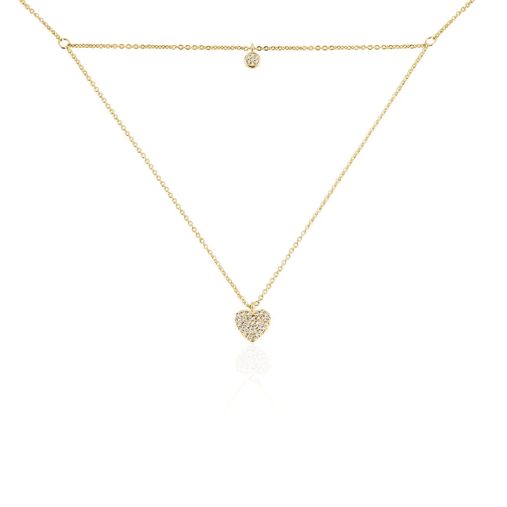 Collier Plaque Or Jaune Double Chaines Cœur Pavage Oxydes De Zirconium 48cm