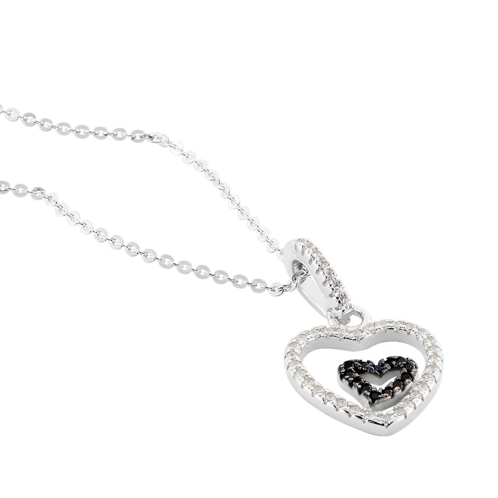 Collier Argent Blanc 925/1000 Double Coeur Ajoure Pavage Oxydes De Zirconium Blancs Et Noirs 42cm